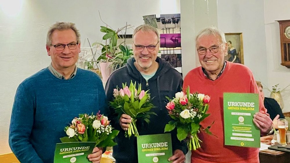 Gleich drei Mitglieder wurden für ihre langjährige Parteizugehörigkeit ausgezeichnet: Kurt Williges und Andreas Beichler für 25 Jahre grüne Politik, Jens Williges sogar für 40 Jahre. Dieter Albrecht würdigte ihr Engagement im Namen Vorstands und gab die ein oder andere Anekdote zum Besten. Ein kleiner Wermutstropfen: Fast hätte Andreas Beichler seine Auszeichnung auf den Tag genau 25 Jahre nach seinem Eintritt erhalten. Doch das Winterwetter führte zu einer Verschiebung der Mitgliederversammlung um rund eine Woche.